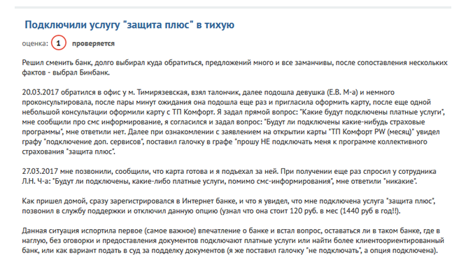 Из минусов: многие держатели жалуются на то, что банк подключает им страхование, от которого они при подаче анкеты отказались. Некоторые в недоумении, что при снятии собственных средств в отделениях Бинбанка с них взимают комиссию. Редко какие банки берут плату за данную операцию. Конечно, это прописано в тарифных планах, но далеко не все их читают.