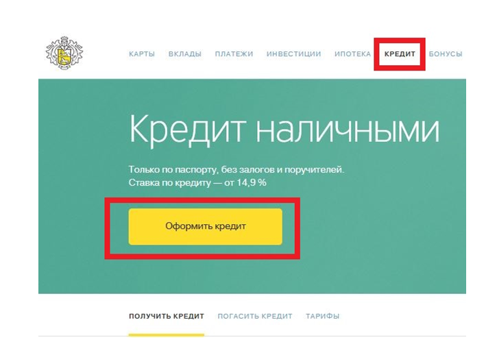 Шаг 1. Зайти во вкладку «Кредит», нажать желтую кнопку «Оформить кредит».