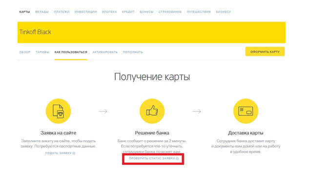 Удобно, что через 24 часа после оформления онлайн-заявки за ее статусом можно следить на сайте Тинькофф. Для этого надо зайти в раздел «Карты» – «Дебетовые» – «Tinkoff Black» – «Как пользоваться». Под надписью «Решение банка» нажать на стрелочку «Проверить статус заявки».