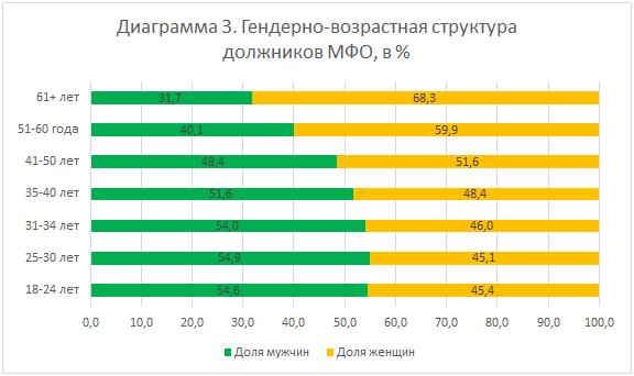 В гендерном разрезе процентное соотношение должников также сильно зависит от возраста. Если среди заемщиков в возрасте от 18 до 30 лет преобладают мужчины, на которых приходится 55% задолженностей, то в категории заемщиков старше 50 лет крен смещается в сторону женщин, так как они составляют 60% заемщиков. Эксперты связывают такую тенденцию с разводами, которые вынуждают женщин справляться в одиночку.