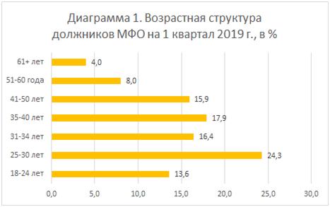 Согласно исследованию Национальной ассоциации коллекторских агентств (СРО НАПКА), почти четверть заемщиков, просрочивших выплату по займу более чем на 90 дней, приходится на возрастную группу 25–30 лет. 18% нарушителей платежного графика приходится на заемщиков в возрасте от 35 до 40 лет, на третьем месте оказалась возрастная группа 31–34 лет.