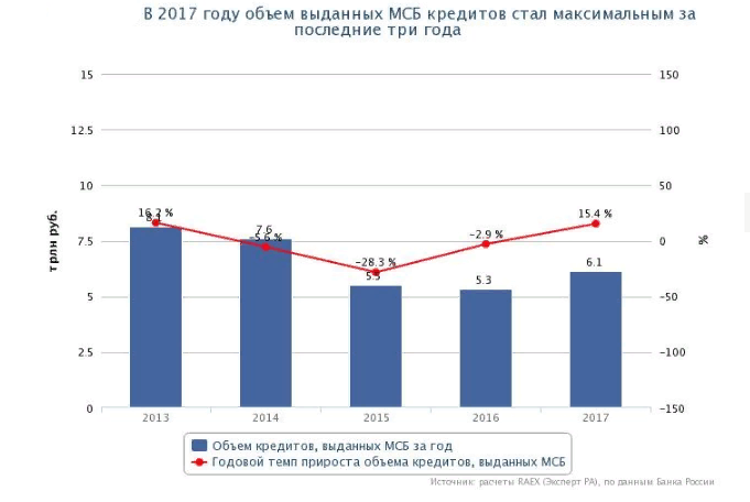 Объем выдачи займов МСБ в 2017 году подрос на 15% по сравнению с годом ранее. По сведениям "Эксперт РА" по итогам предыдущего года предприниматели набрали кредитов объемом 6,1 трлн руб.