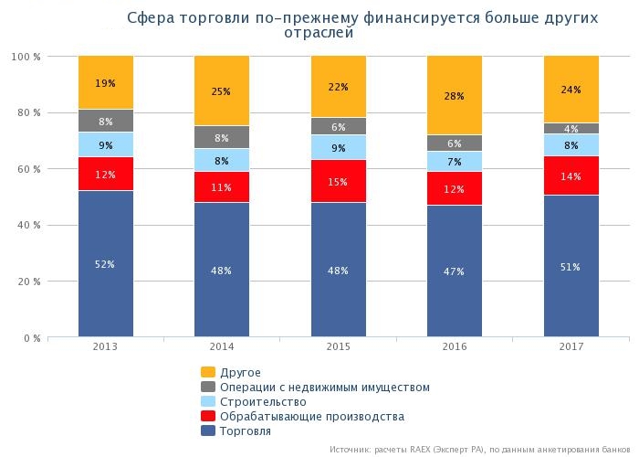 Более 50% займов, выданных малым предпринимателям, приходится на сферу торговли. По 14% займов пришлось на малые организации в строительстве и обрабатывающей промышленности, 6% — у финансовых и страховых предприятий. Доля сельского хозяйства не превышает сейчас 3%, но эксперты подтверждают, что данная отрасль кредитуется все более активно в последнее время.