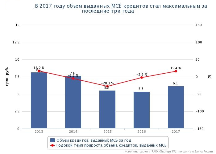 Объем выдачи займов МСБ в 2017 году подрос на 15% по сравнению с годом ранее. По сведениям "Эксперт РА" по итогам предыдущего года предприниматели набрали кредитов объемом 6,1 трлн руб.