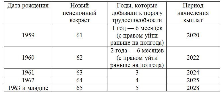 Закон о пенсионном возрасте утверждает новые рамки для выхода на пенсию, реформирует права льготников. Он закрепляет возраст выхода на пенсию в 65 лет для мужского пола и в 60 лет для женского вместо 60 и 55 лет соответственно. Рамки возраста выхода на пенсию поднимут постепенно, в ходе десятилетнего промежутка времени — с 2019 по 2028 год.