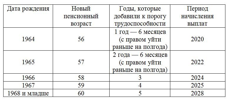 Закон о корректировке возрастных рамок для оформления пенсии принят в октябре 2018 года. Закон о пенсионном возрасте закрепляет медленный рост возрастных рамок для женского пола с 60 до 63 лет к 2034 году. Для представителей сильного пола с 60 до 65 лет к 2028 году.