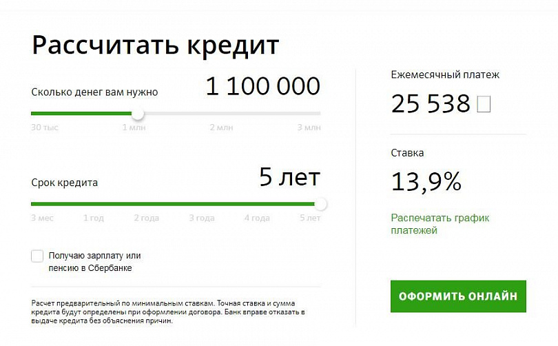 При выборе суммы онлайн кредита наличными в Сбербанке без поручителей надо учитывать размер платежа в месяц. Чтобы упростить эту задачу собственным клиентам, компания предусмотрела кредитный калькулятор на странице с предложением. Достаточно установить в калькуляторе требуемый размер займа и срок кредитования. Или можно узнать расчет ежемесячного платежа по кредиту прямо на сайте credits.ru.